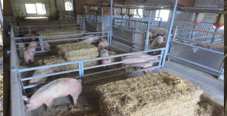 Unsere Schweine toben im Stroh und haben doppelt soviel Platz. Nur eigenes Futter ohne Gentechnik.
